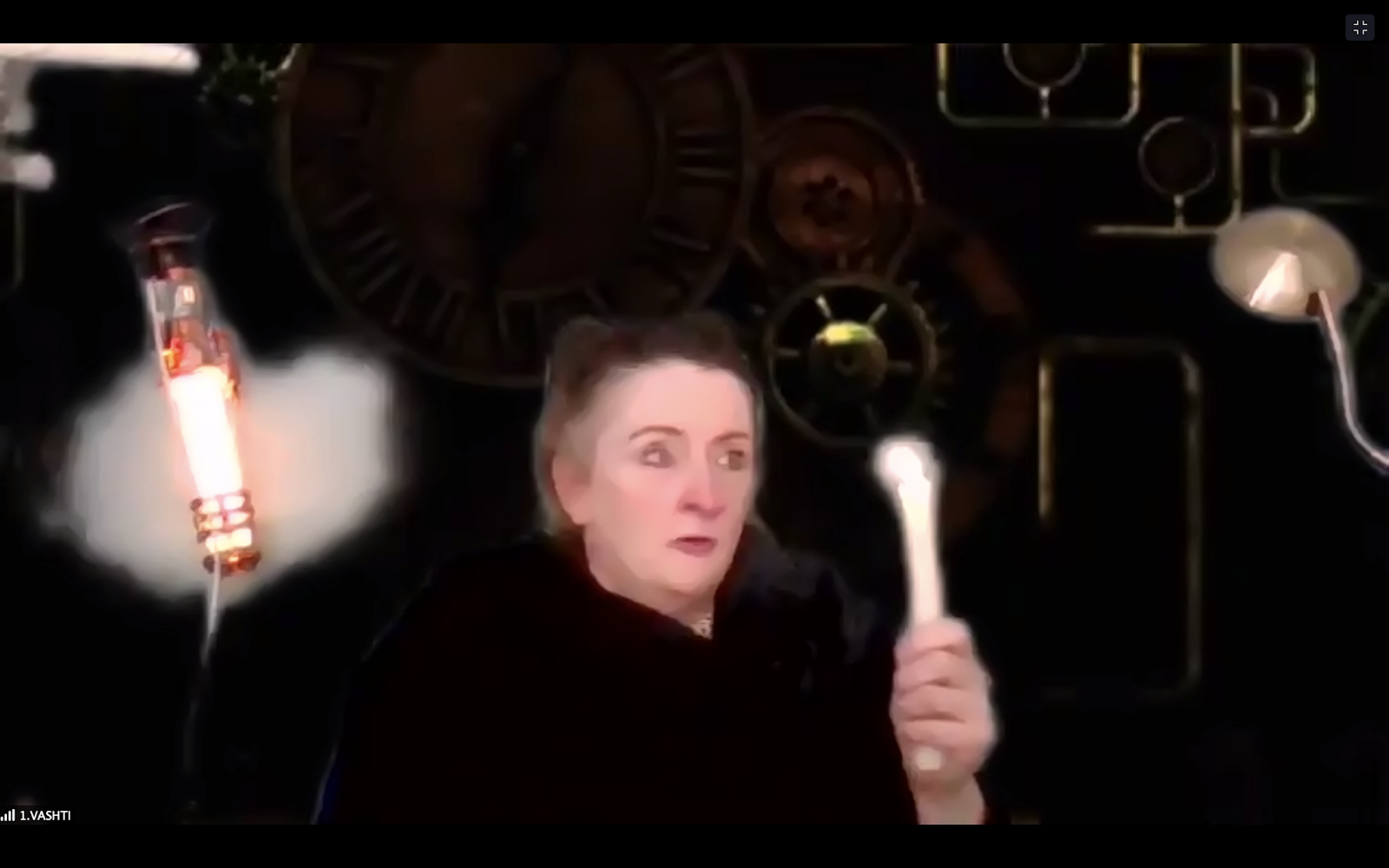 The Machine Stops is visually much more ambitious that Operation Elsewhere, with a clever sense of depth achieved in some scenes by inserting layers of David Morgan’s beautiful steampunk props (and some repurposed household furniture and fittings) in-between the cameras, actors and green-screened backdrops. It’s a sign of Big Telly’s increasing confidence with Zoom. Kuno’s chamber even plays with perspective in a way that might open up the possibility of much-needed movement in future works (if cast members’ spare rooms allow). I know it’s theatre and not film, but watching it on a screen means that comparisons are hard to ignore, and the consistent use of medium close-up shots – which often mirroring the pose of audience members (if you sneak a quick peek at the gallery view) – means that over the hour-long performance, the fun props can only go so far to distract from the lack of on-screen physicality and interaction.